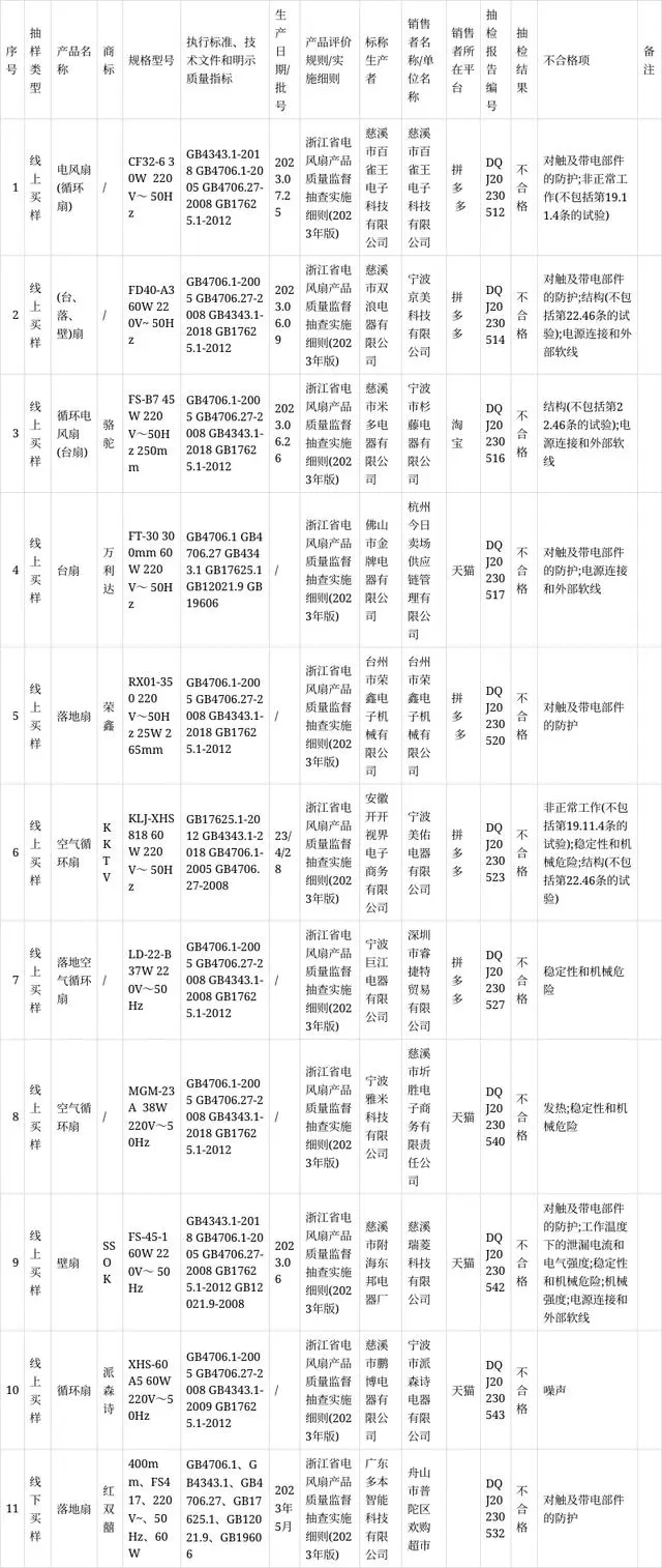 本次抽查了40批次電風(fēng)扇產(chǎn)品,其中11批次產(chǎn)品不合格。不合格項(xiàng)目為對(duì)觸及帶電部件的防護(hù)、非正常工作、結(jié)構(gòu)、電源連接和外部軟線、發(fā)熱、穩(wěn)定性和機(jī)械危險(xiǎn)、工作溫度下的泄漏電流和電氣強(qiáng)度、機(jī)械強(qiáng)度、噪聲。