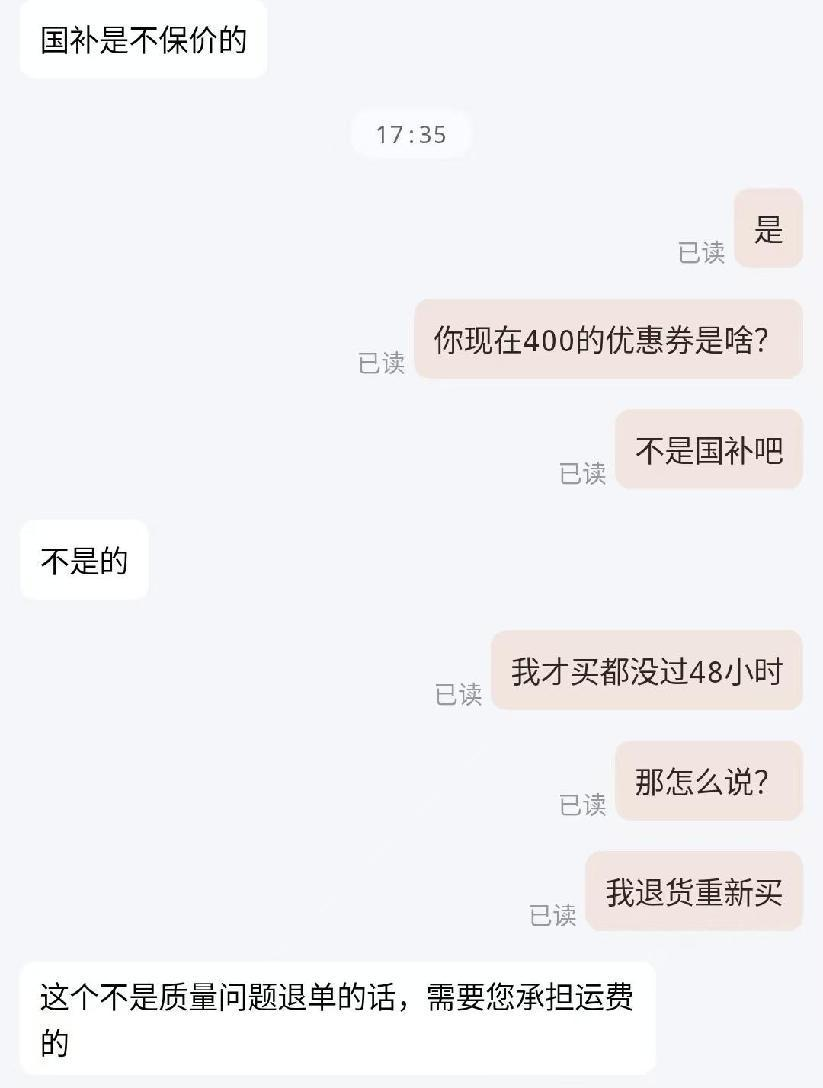 面對這突如其來的降價,李先生深感憤怒與無奈。他嘗試通過平臺客服協(xié)調退還差價,但得到的答復卻是:由于產品享受了政府補貼,差價不予退還。李先生氣憤地表示:“有種被當傻子耍的感覺?!苯涍^多次溝通,李先生最終與客服協(xié)商達成了無條件退貨的協(xié)議,退貨運費由平臺承擔。隨后,李先生又用家人的賬號領取政府補貼后,加上新的活動優(yōu)惠,以低于原購買價500元的價格于同一網購平臺再次購買了同一款空氣凈化器。