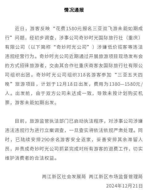 據(jù)通報,經(jīng)初步調(diào)查,涉事公司奇妙時光國際旅行社(重慶)有限公司(以下簡稱“奇妙時光公司”)涉嫌低價攬客等違法違規(guī)經(jīng)營行為。奇妙時光公司近期通過開展旅游項目現(xiàn)場發(fā)布會的方式招徠旅游者,交由其合作方重慶商客友國際旅行社有限公司組織出團(tuán)。奇妙時光公司組織318名游客參加“三亞五天四晚”旅游項目,計劃于12月18日出發(fā),費(fèi)用為每人1380至1580元。出發(fā)前,由于雙方公司未達(dá)成一致,導(dǎo)致未按計劃購買機(jī)票,游客未能如期出發(fā)。