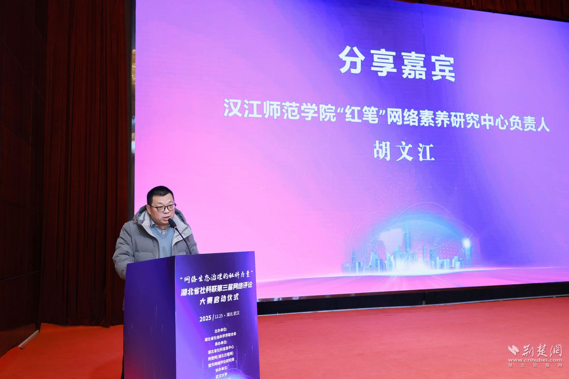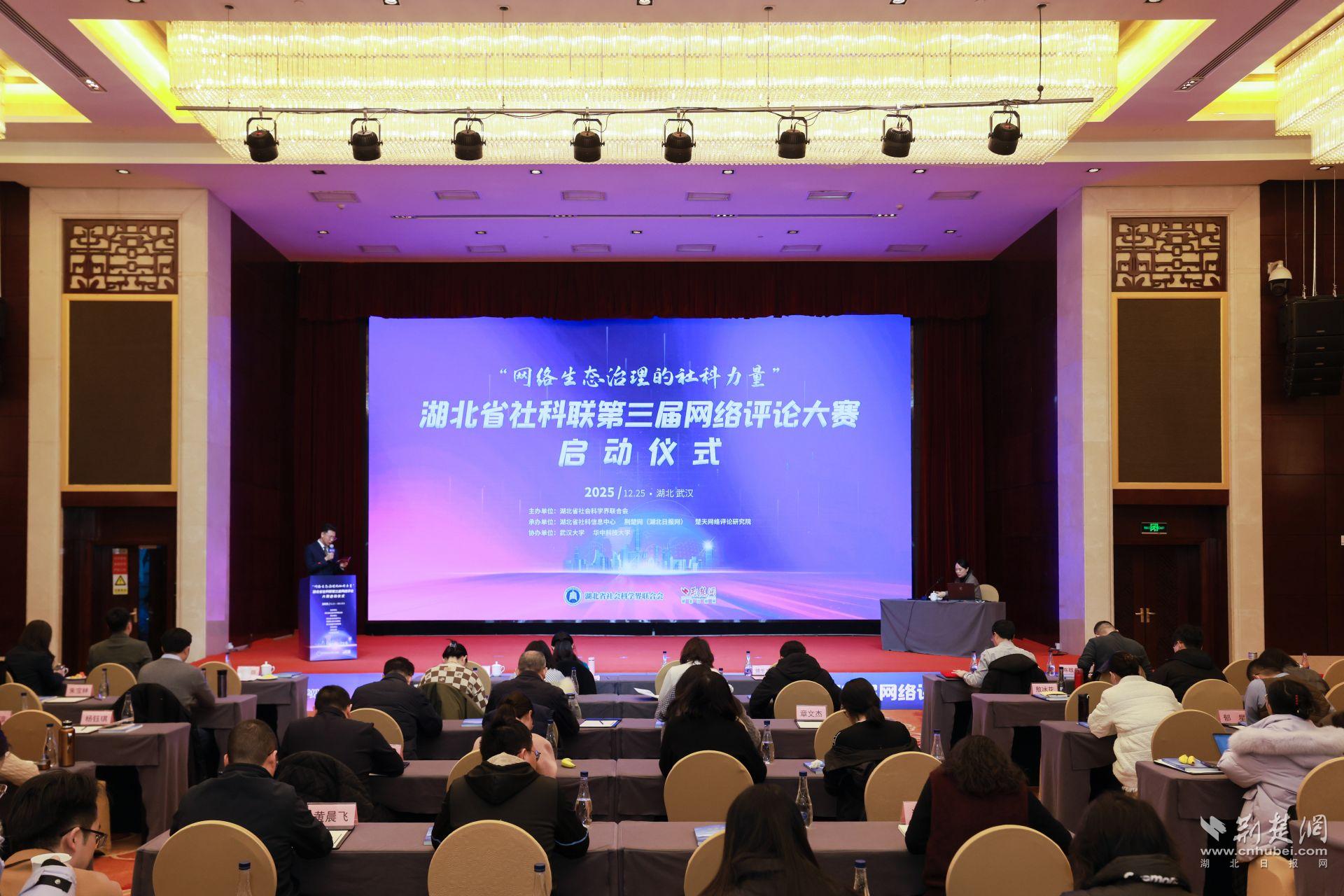 荊楚網(wǎng)(湖北日報(bào)網(wǎng))訊 (記者 丁楚風(fēng))冬日蓄勢,春潮待發(fā)。12月25日,武漢楚天粵海國際大酒店內(nèi)暖意融融,思想的火花在這里迸發(fā)碰撞。由湖北省社會科學(xué)界聯(lián)合會主辦,湖北省社科信息中心、荊楚網(wǎng)(湖北日報(bào)網(wǎng))、楚天網(wǎng)絡(luò)評論研究院承辦的“網(wǎng)絡(luò)生態(tài)治理的社科力量”——湖北省社科聯(lián)第三屆網(wǎng)絡(luò)評論大賽正式啟動。