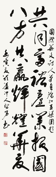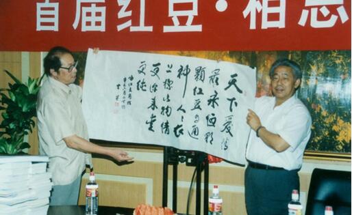 在《七夕,紅豆最相思的詩意探訪》論壇主題引導(dǎo)下,詩人們暢談紅豆愛情詩的淵源,以及對中國新詩的助推、發(fā)展的歷史作用,使中華文化傳統(tǒng)薪火相傳,在我們這一代詩人手里發(fā)揚(yáng)光大,繪出獨(dú)特的、現(xiàn)代人審美的愛情詩篇。會上,北京電視臺節(jié)目主持人、詩人黃殿琴朗誦了張?jiān)妱Α⒐鹋d華、綠島寫的紅豆愛情詩歌,并展示了多位詩人等為紅豆集團(tuán)寫的多幅書法,表達(dá)了友誼深情?!肮餐辉.a(chǎn)業(yè)報(bào)國 八方共贏輝煌華夏”是詩人黎勇先生寫給紅豆集團(tuán)的書法 ,國際華文詩人筆會主席張?jiān)妱懡o紅豆集團(tuán)書法為“紅豆最相思”等。