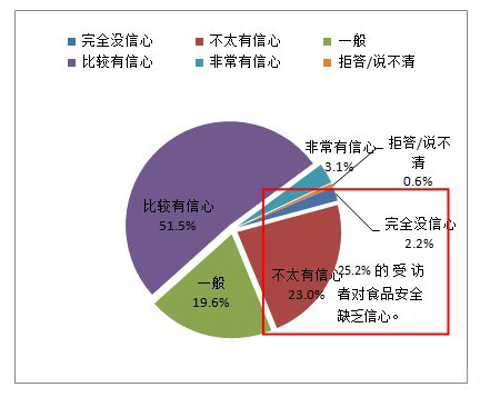 雖然,今年市民對(duì)食品安全比較有信心,但是食品安全問(wèn)題現(xiàn)狀仍不可忽視,其中25.2%的市民對(duì)食品安全缺乏信心,51.5%的市民比較有信心,僅3.1%的市民非常有信心。
