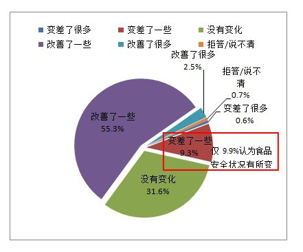 過(guò)去一年,國(guó)家多個(gè)部門發(fā)布了食品行業(yè)的新政策與新法規(guī),對(duì)食品工業(yè)行業(yè)嚴(yán)加把關(guān),多數(shù)市民也認(rèn)為食品安全狀況得到了改善。55.3%的市民認(rèn)為食品安全狀況改善了一些,2.5%的市民認(rèn)為食品安全狀況改善了很多,而在2011年只有35.4%的受訪者認(rèn)為食品安全狀況在過(guò)去一年有所改變,2012年比2011年提升19.9%。