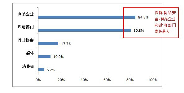 在保障食品安全的責(zé)任問(wèn)題上,84.8%的市民認(rèn)為食品企業(yè)責(zé)任最大,80.8%的市民認(rèn)為政府部門責(zé)任最大,行業(yè)協(xié)會(huì)、媒體、消費(fèi)者也被認(rèn)為負(fù)有一定的責(zé)任,但比重較小,分別為17.7%、10.9%和5.2%。