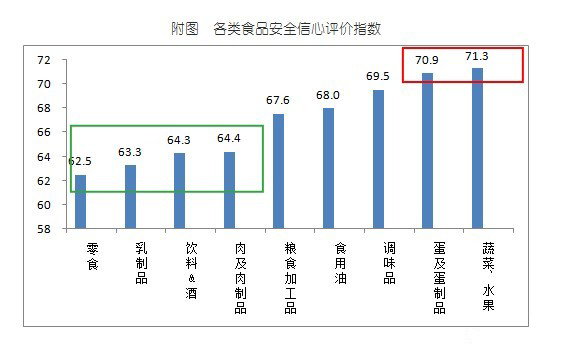 各類食品中,市民對(duì)蔬菜水果、蛋及蛋制品的安全最有信心,分別高達(dá)71.3和70.9;而對(duì)零食、乳制品、飲料&酒和肉及肉制品的食品安全評(píng)價(jià)較低,全部低于65。而在2011年,消費(fèi)者對(duì)食品安全的評(píng)價(jià)中,肉及肉制品、乳制品的信心評(píng)價(jià)也較低。