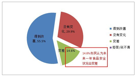 總體來說,市民對未來食品安全的改善比較有信心。55.5%的市民認為未來一年的食品安全會得到改善,14.6%的市民認為會變差,還有29.9%的市民認為會沒有變化。