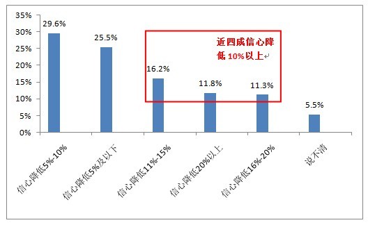 在認為未來一年食品安全狀況會變差的市民中,有29.6%的市民信心降低了5%~10%,25.5%的市民信心降低程度低于5%,信心降低20%以上和信心降低16%~20%的市民相對較少,分別為11.8%和11.3%。