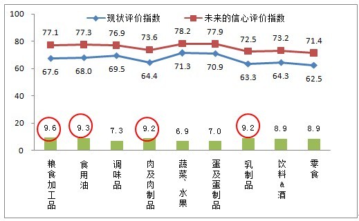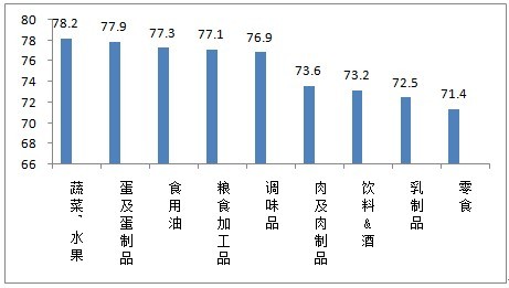 從未來發(fā)展趨勢來看,市民對蔬菜、水果的信心評價指數最高為78.2,其次是蛋及蛋制品為77.9,未來信心偏低的依然是零食、乳制品、飲料&酒和肉及肉制品。