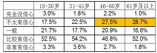就未來(lái)一年食品安全狀況改善的信心來(lái)看,46歲以上年齡較大的市民對(duì)未來(lái)改善的信心不足。