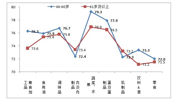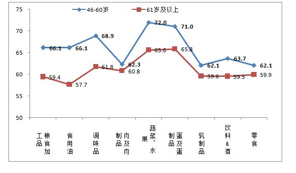 進(jìn)一步分析46歲以上市民對(duì)食品安全現(xiàn)狀擔(dān)憂的食品領(lǐng)域,46-60歲市民對(duì)肉及肉制品、乳制品、飲料&酒和零食的安全信心指數(shù)評(píng)價(jià)較低,直接拉低他們目前對(duì)食品安全的放心程度。61歲以上市民目前對(duì)九大類食品的安全信心指數(shù)都偏低,除蔬菜水果和蛋及蛋制品外,其它食品的信心指數(shù)都低于65。