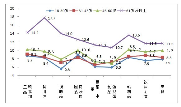 雖然年齡較大的市民對(duì)目前以及未來(lái)的食品安全信心比較不樂觀,但是他們對(duì)于九大類食品未來(lái)安全信心指數(shù)的增長(zhǎng)抱有很大的期望,尤其是61歲以上的市民,其中他們對(duì)食用油、糧食加工品、調(diào)味品和乳制品的信心增長(zhǎng)最為樂觀。