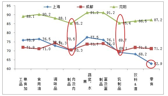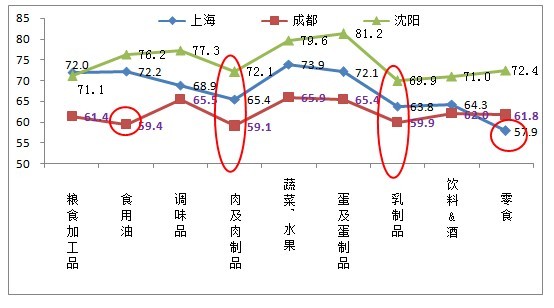 針對食品安全現(xiàn)狀信心指數(shù)較低的三個城市:上海、成都、沈陽。沈陽表現(xiàn)相對較好,信心指數(shù)較高;其次是上海;最低的是成都。其中肉及肉制品和乳制品在三大城市中的安全信心指數(shù)都相對偏低,直接影響了三大城市的綜合信心程度。此外,食用油在成都的安全信心指數(shù)、零食在上海的安全信心指數(shù)也有待提高。