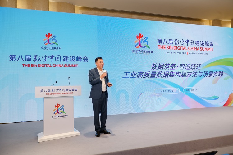 中國(guó)聯(lián)合網(wǎng)絡(luò)通信集團(tuán)有限公司大數(shù)據(jù)首席科學(xué)家范濟(jì)安作“數(shù)據(jù)筑基·智造躍遷——工業(yè)高質(zhì)量數(shù)據(jù)集構(gòu)建方法與場(chǎng)景實(shí)踐”發(fā)言。
