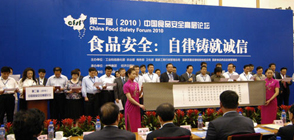 主題為“食品安全:自律鑄就誠信”的第二屆(2010)中國食品安全高層論壇今天在北京舉行。中糧聯(lián)合華潤、娃哈哈等100多家知名食品企業(yè)在論壇上共同發(fā)表誠信宣言,向社會鄭重承諾:鉻記榮辱義利,維護(hù)人民福祉。
