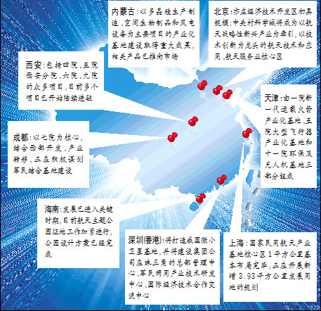 上海國家民用航天產(chǎn)業(yè)基地核心區(qū)1平方公里基本布局完畢,并正在開展新增3.93平方公里發(fā)展用地的概念性規(guī)劃和控制性詳細規(guī)劃。西安國家民用航天產(chǎn)業(yè)基地包括四院、五院西安分院、六院、九院的眾多項目,目前多個項目已開始陸續(xù)進駐。在四川成都,以七院為核心,結(jié)合西部開發(fā)、產(chǎn)業(yè)轉(zhuǎn)移,正在積極謀劃軍民結(jié)合基地建設(shè)。在中國北疆的內(nèi)蒙古,集團公司以多晶硅生產(chǎn)制造、空間生物制品和風電設(shè)備為主要項目的產(chǎn)業(yè)化基地建設(shè)取得重大成果,相關(guān)產(chǎn)品已推向市場,取得了較好的經(jīng)濟效益。