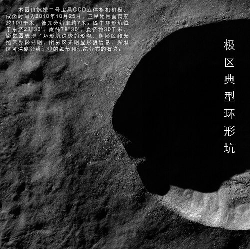 北京,2010年11月8日 國家國防科技工業(yè)局首次發(fā)布嫦娥二號月面虹灣局部影像圖 這是極區(qū)典型環(huán)形坑(成像時間為10月25日)。