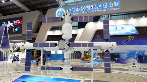 在此次航展中,中國(guó)航天科技集團(tuán)公司推出代表月球探測(cè)工程最新成果的“嫦娥二號(hào)”衛(wèi)星模型,代表“北斗導(dǎo)航”工程、直徑達(dá)7米、蔚為壯觀的天地一體衛(wèi)星運(yùn)行沙盤,1:1的“天宮一號(hào)”目標(biāo)飛行器模型、新一代運(yùn)載火箭以及代表深空探測(cè)計(jì)劃的“螢火一號(hào)”衛(wèi)星模型等國(guó)家重大工程項(xiàng)目近100項(xiàng)新展品首次亮相。圖為長(zhǎng)期有人照料的空間站模型。(宗文)